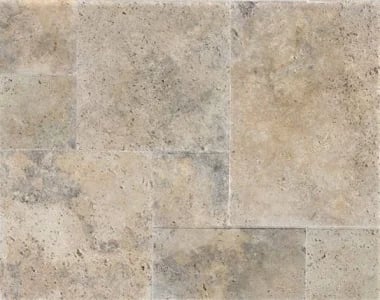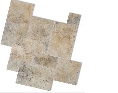 Antique Travertine French Pattern Tiles and Pavers have tumbled edges with a non-slip brushed surface finish. It is a beautiful blend of cream, yellow, brown colours with highlights of silver providing it with a classic antique look.